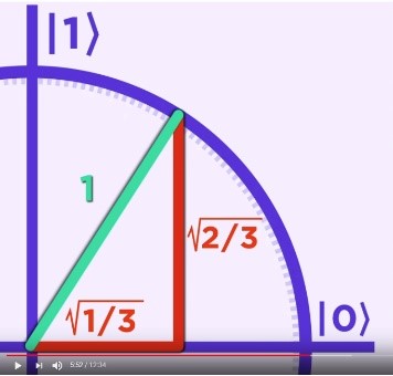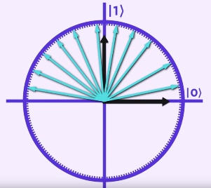 Men vektoren kan også ha andre posisjoner på enhetssirkelen, slik som figuren her viser. Da har den en komponent både i y-retning, som viser 1-verdien, og en komponent mot x-aksen, som viser 0-veriden. Slik har qubit-vektoren både en 1-verdi og en 0-verdi, altså begge verdiene samtidig. Egentlig har vektoren komponenter i de to retningene. Når vektoren beveger seg langs sirkelperiferien, sier vi at den er i en superposisjon. X-verdien og y-verdien angir sannsynligheten for at den kollapser med verdien 0 eller 1 når den blir avlest.